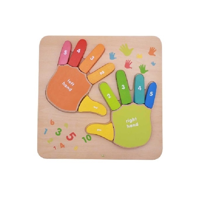 Панель выполнена из березовой фанеры, на лицевой стороне которой представлены кисти рук, каждая из которых подписана: левая и правая, а каждый палец с одной стороны - пронумерован, а с другой стороны - написано его название. Предназначена для  обучения счету от 0 до 10, навыкам сложения и вычитания с помощью пальцев рук.