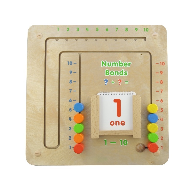 Эта учебная панель обеспечивает визуальное представление чисел от одного до десяти и имеет 10 цветных цилиндров, которые можно перемещать по рельсам. Две вертикальные шкалы показывают общее количество цилиндров в каждом столбце, сумма которых равна 10. Таким образом, 5 плюс 5 равны 10, как 1 и 9, 2 и 8 и так далее. Карточки добавляют визуализацию процессу. Пособие представляет из себя панель, выполненную из березовой фанеры толщиной 18мм.