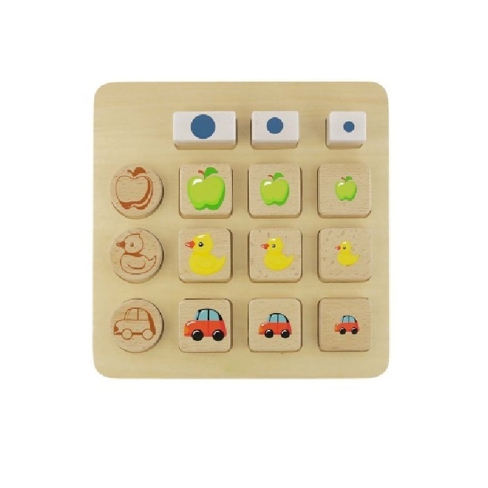Основание панели из березовой фанеры, на лицевой части   представлены деревянные блоки разных геометрических форм. Детям предлагается сопоставить блоки в соответствии с размерами от большего к меньшему, либо разместить блоки правильно в соответствующие выемки - углубления.