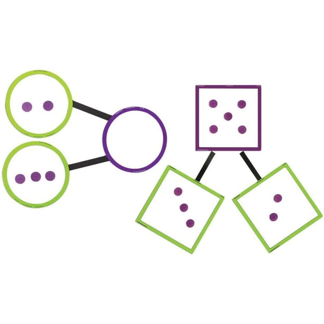 Два набора, в формате круга и квадрата, позволяют многократно продемонстрировать числовые связи. Регулярно меняйте формат и порядок каждый раз, когда вы размещаете числа на доске. Например, вы можете поместить фиолетовый круг (целое) сверху и два зеленых круга снизу (часть/часть), или фиолетовый квадрат слева (целое) и два зеленых квадрата (часть/часть) справа. Также вы можете использовать одновременно круги и квадраты, чтобы показать часть-часть-целое для усиления коммутативного свойства сложения.