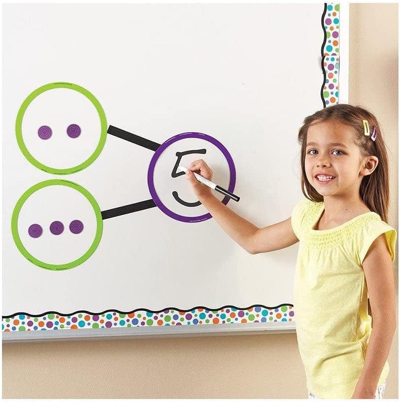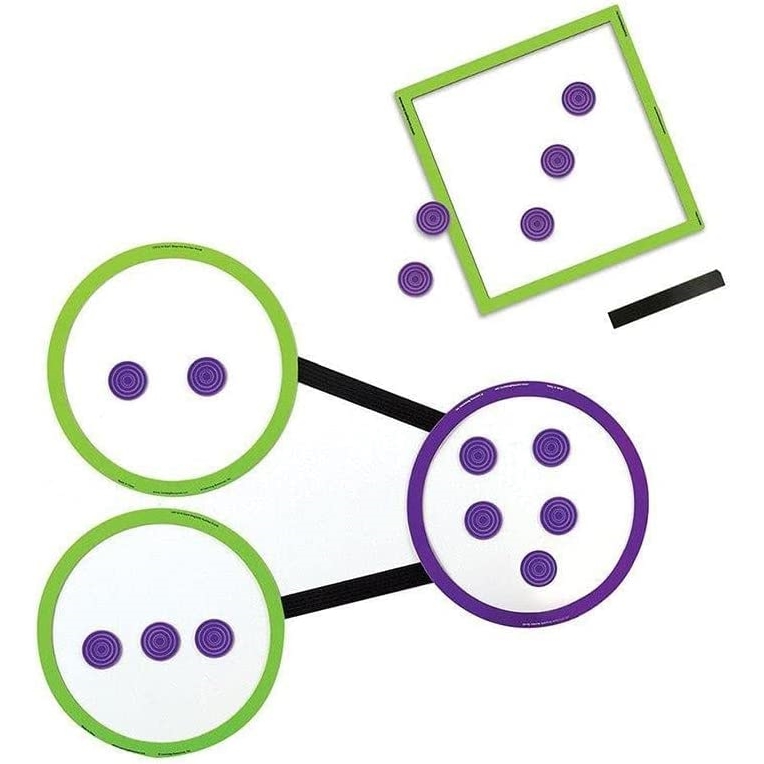 Начните с размещения двух разных магнитных дисков (3 и 2, например) в зеленых кругах или квадратах. Попросите ученика подойти к доске, потрогать и сосчитать каждый диск, а затем поместить сумму (5) в фиолетовый круг или квадрат (или просто напишите число 5). Продолжайте с другими примерами. Выполните те же действия с вычитанием.