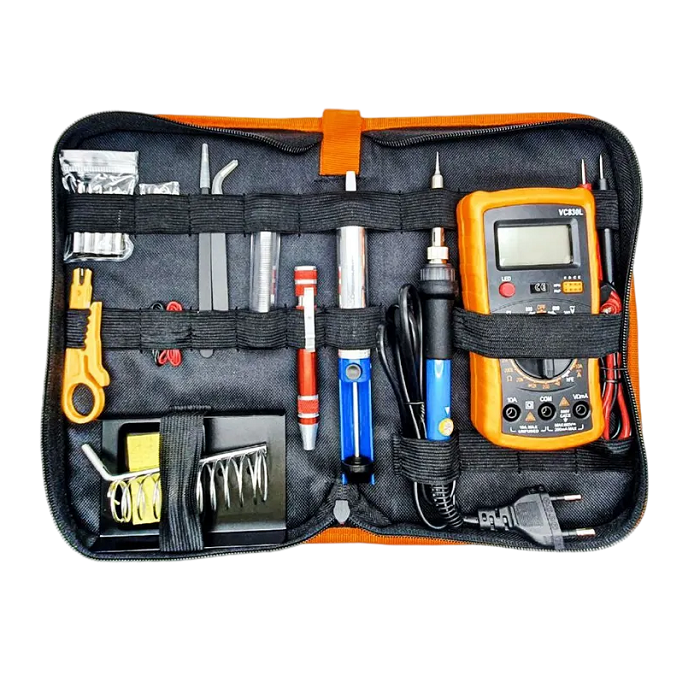 Профессиональный набор инструментов для пайки.Включает все необходимые инструменты. Мультиметр – тестер, оловоотсос, пинцет, щипцы, стриппер для удаления изоляции с проводов, подставку для паяльника, паяльник с регулировкой мощности от 200 до 450 градусов с дополнительным набором жил. Он может использоваться как для пайки микросхем так и для выжигания по дереву в комплекте идет тубус с припойной проволокой содержащий флюс. Набор для пайки будет полезным подарком для близких - мужу, папе, дедушке, сыну, другу.
