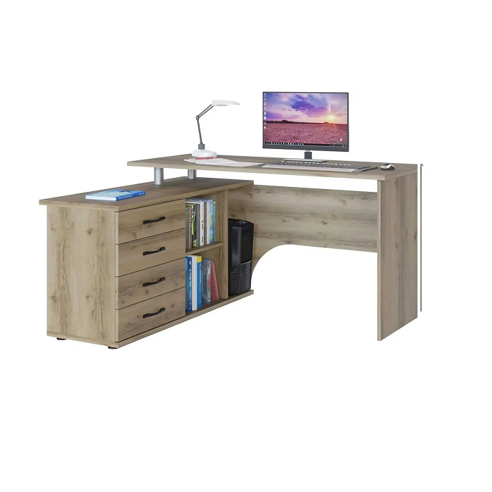 Основная столешница модели имеет ширину 140 см и позволяет расположить на ней непосредственно сам компьютер и сопутствующие ему периферийные устройства, а также, при необходимости, поместить настольное освещение. Угловая столешница, расположенная слева, оборудована нишей для системного блока, полкой для книг и тумбой с 4 вместительными выдвижными ящиками. На ней можно разместить необходимые для работы документы, книги, папки и канцелярские принадлежности.