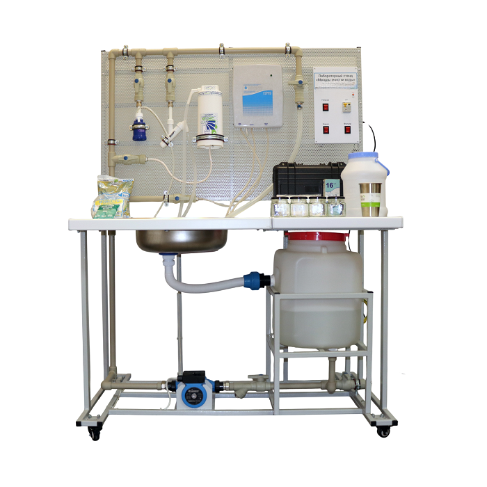 Лабораторная установка позволяет изучать эффективность очистки питьевой воды от примесей с помощью бытовых фильтров. Комплектуется набором химических средств анализа качества воды.
