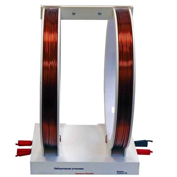 Установка состоит из двух плоских одинаковых катушек расположенных параллельно друг другу так, что оси их совпадают. Считается, что по середине между катушками вблизи оси симметрии магнитное поле создаваемое катушками является однородным с достаточной степенью точности. Между катушками находится подъемный столик для размещения демонстрационных элементов.