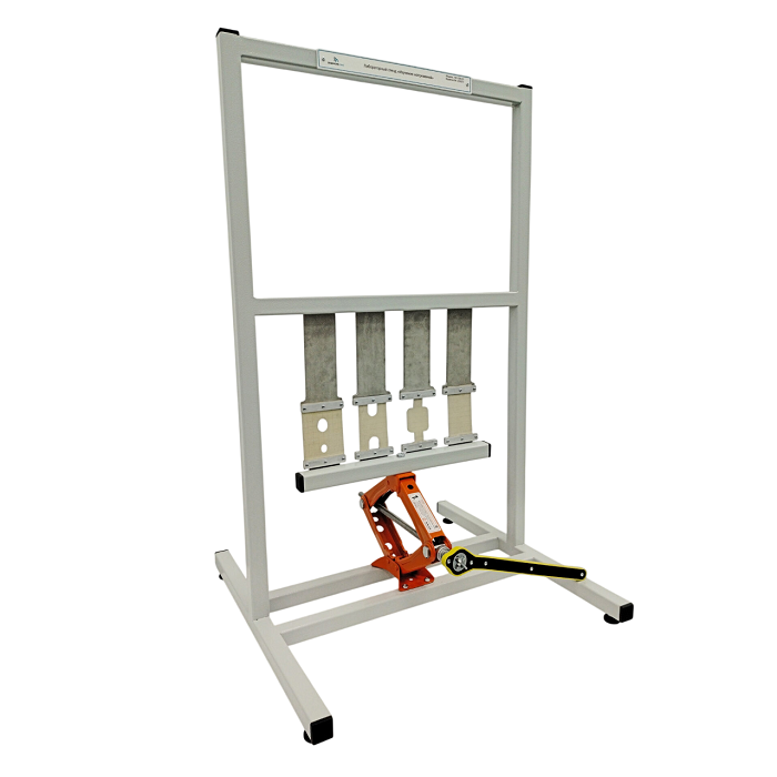 Стенд представляет собой сварную раму, на которой установлен винтовой механизм двойного действия. Нижняя подвижная траверса состоит профиля квадратного сечения. На подвижной и неподвижной траверсах закреплена часть оснастки для установки образцов.