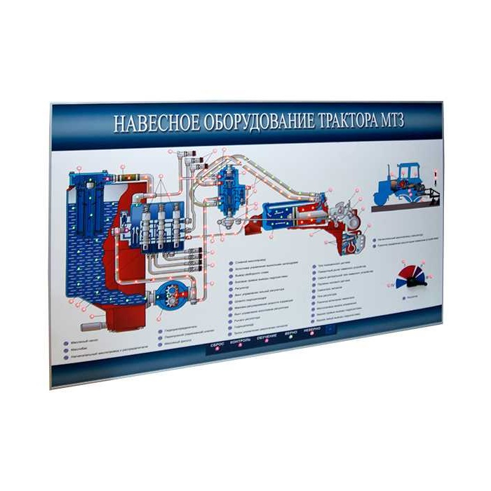 Стенд планшет представляет собой полноцветную светодинамическую панель, на которой изображены трактор, его гидравлическая система и установлены автоматические приводные плоскорельефные элементы. В конструкцию учебного оборудования интегрированы высокочувствительные сенсоры для управления стендом при помощи интерактивного воздействия приемо-передающих устройств. Предусмотрено два режима работы со стендом: "Обучение" и "Контроль".