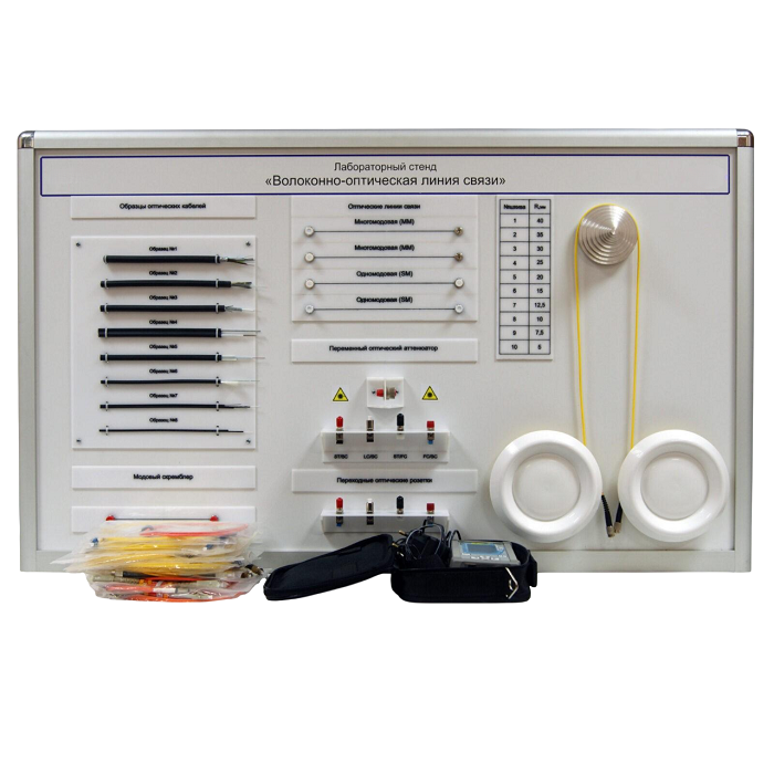 Учебное оборудование предназначено для изучения компонентов волоконно-оптической линии связи.