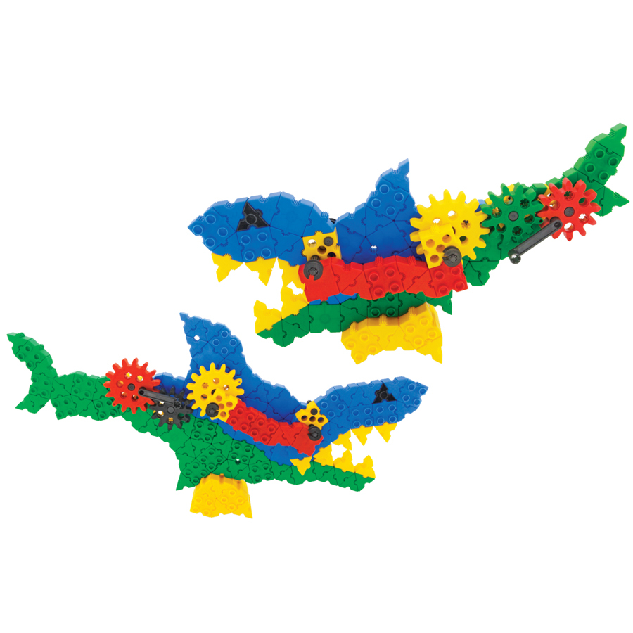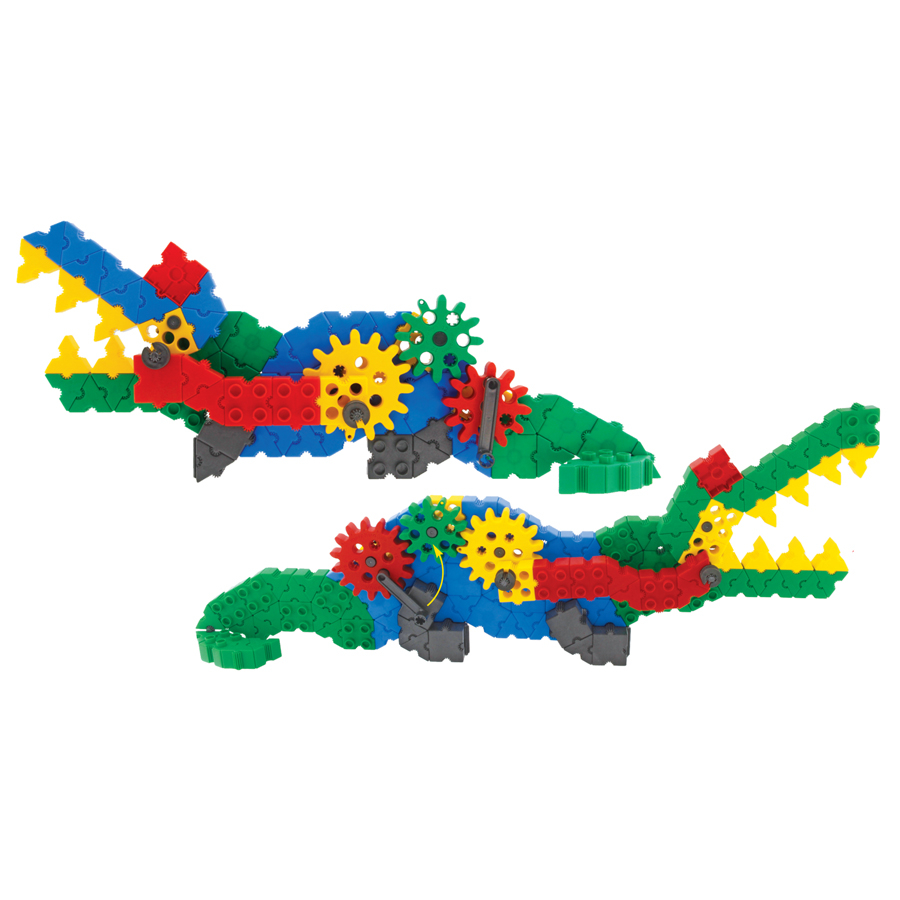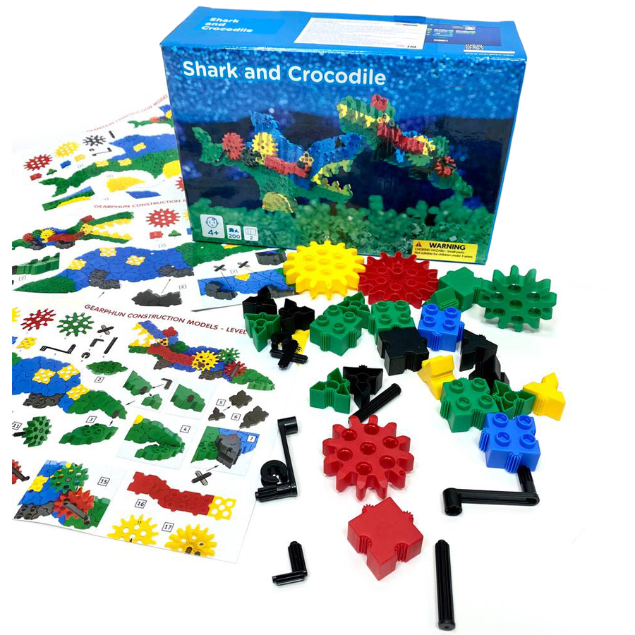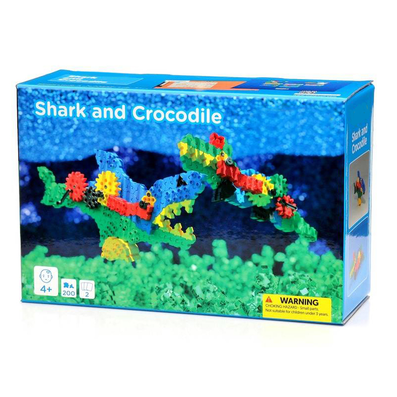 В составе конструктора 200 деталей с уникальным, запатентованным способом соединения деталей, в том числе детали разных форм, размеров, соединительные элементы, фиксаторы и оси. Специальная рукоять и 5 зубчатых колес позволят привести в движение челюсти акулы и крокодила. С их помощью собранные игрушечные модели будут двигаться, словно настоящие!