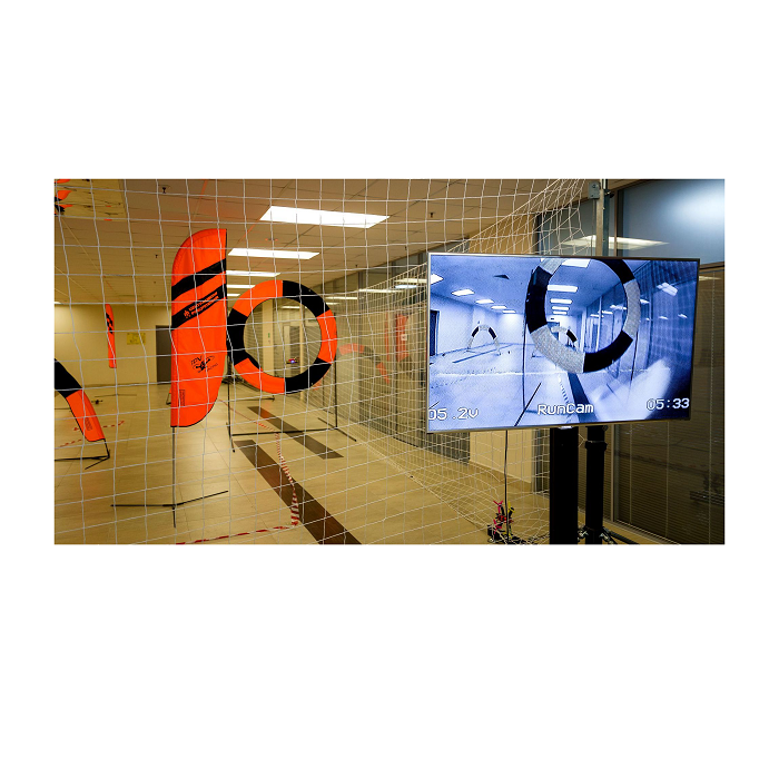 Трасса для проведения соревнований по дрон-рейсингу, включающая в себя поворотные флаги, курсовые ворота, площадку для взлета-посадки, подвесные кольца.